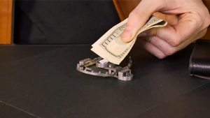 "魔術師把一個小型捕獸夾放在桌上,請觀眾寫上自己的電話號碼,並且把後三碼撕下,放在捕獸夾中間。 魔術師跟觀眾打賭,如果無法將號碼取出,那放在捕獸夾旁的100元就送給觀眾。 魔術師碰觸捕獸夾的瞬間,捕獸夾關上,但手上卻沒有任何的紙條。 魔術師將100元拿開,裡面居然出現了一張紙條,那一張紙條就是觀眾撕下的字條!!"